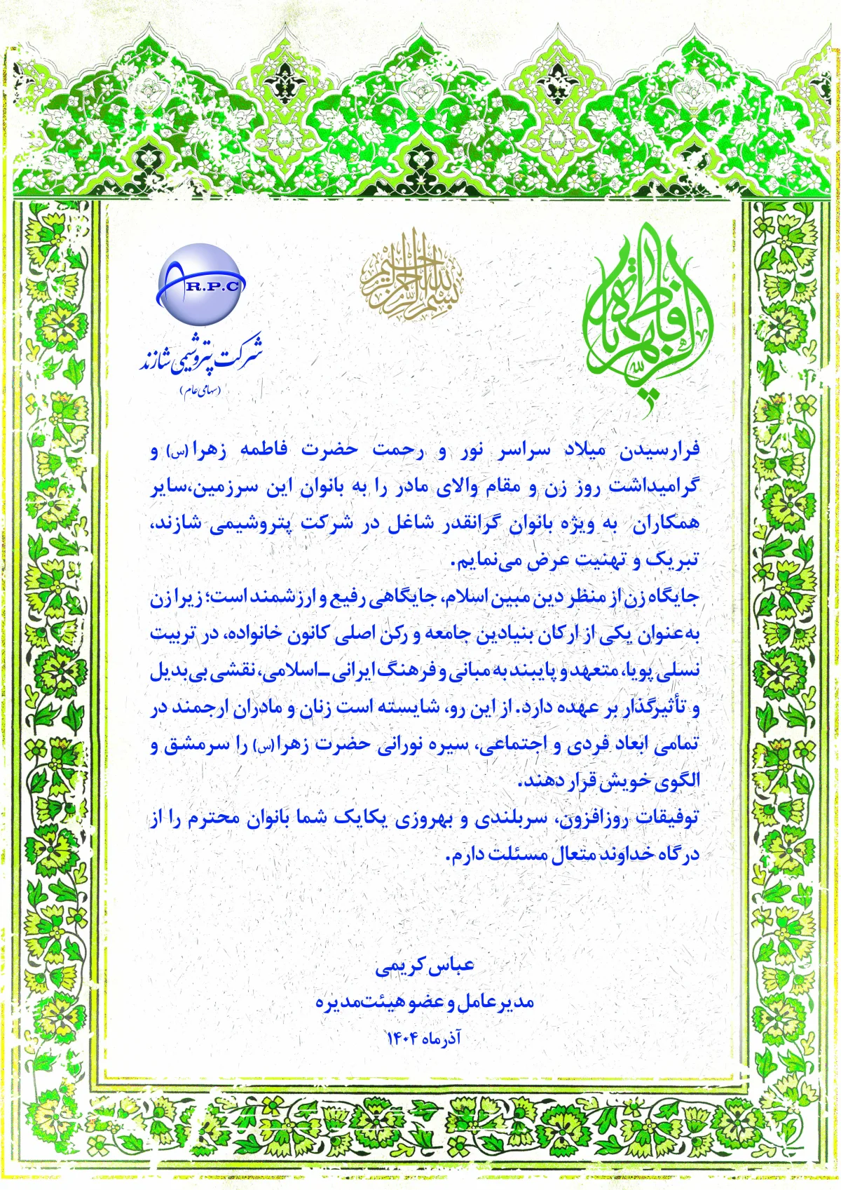 به گزارش روابط عمومی و امور بین الملل، مهندس عباس کریمی مدیرعامل و عضو هیئت مدیره پتروشیمی شازند در پیامی، سالروز ولادت با سعادت حضرت فاطمه زهرا (س) ، روز زن و گرامیداشت مقام مادر را تبریک گفت.