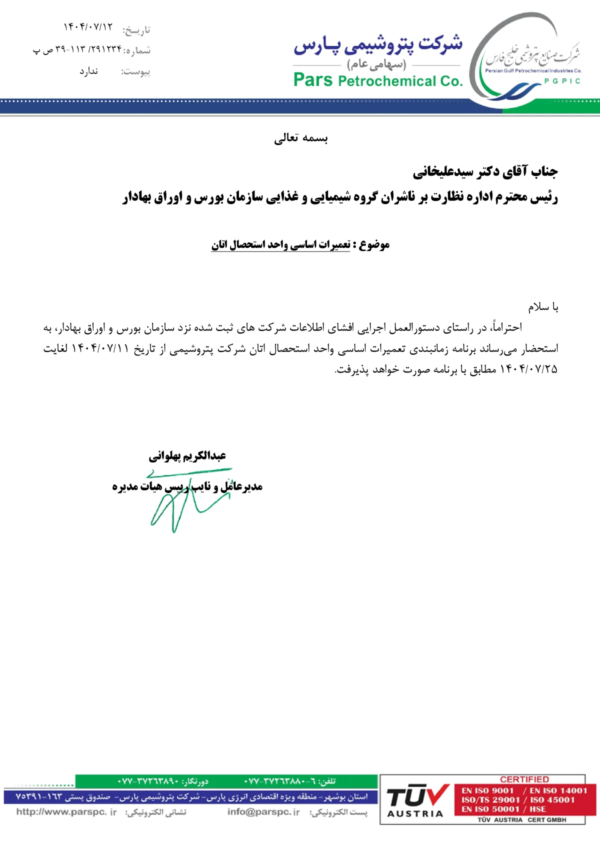 نامه مذکور با امضای عبدالکریم پهلوانی، مدیرعامل و نایب رئیس هیئتمدیره پتروشیمی پارس، صادر و به صورت رسمی به بورس کالا و سهامداران اطلاعرسانی شده است.