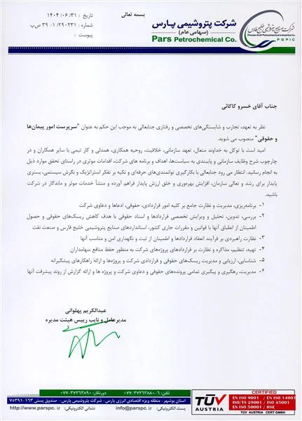 انتصاب سرپرست جدید امور پیمانها و حقوقی در پتروشیمی پارس