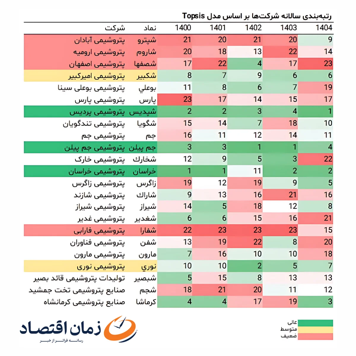 طبق گزارش منتشرشده در «زماناقتصاد» از رتبهبندی سالانه شرکتهای بورسی با مدل TOPSIS در بازه سالهای ۱۴۰۰ تا ۱۴۰۴، پتروشیمی پردیس (شپدیس) در سال ۱۴۰۴ با بهبود جایگاه از رتبه چهارم به رتبه نخست رسیده و در صدر این ارزیابی قرار گرفته است.