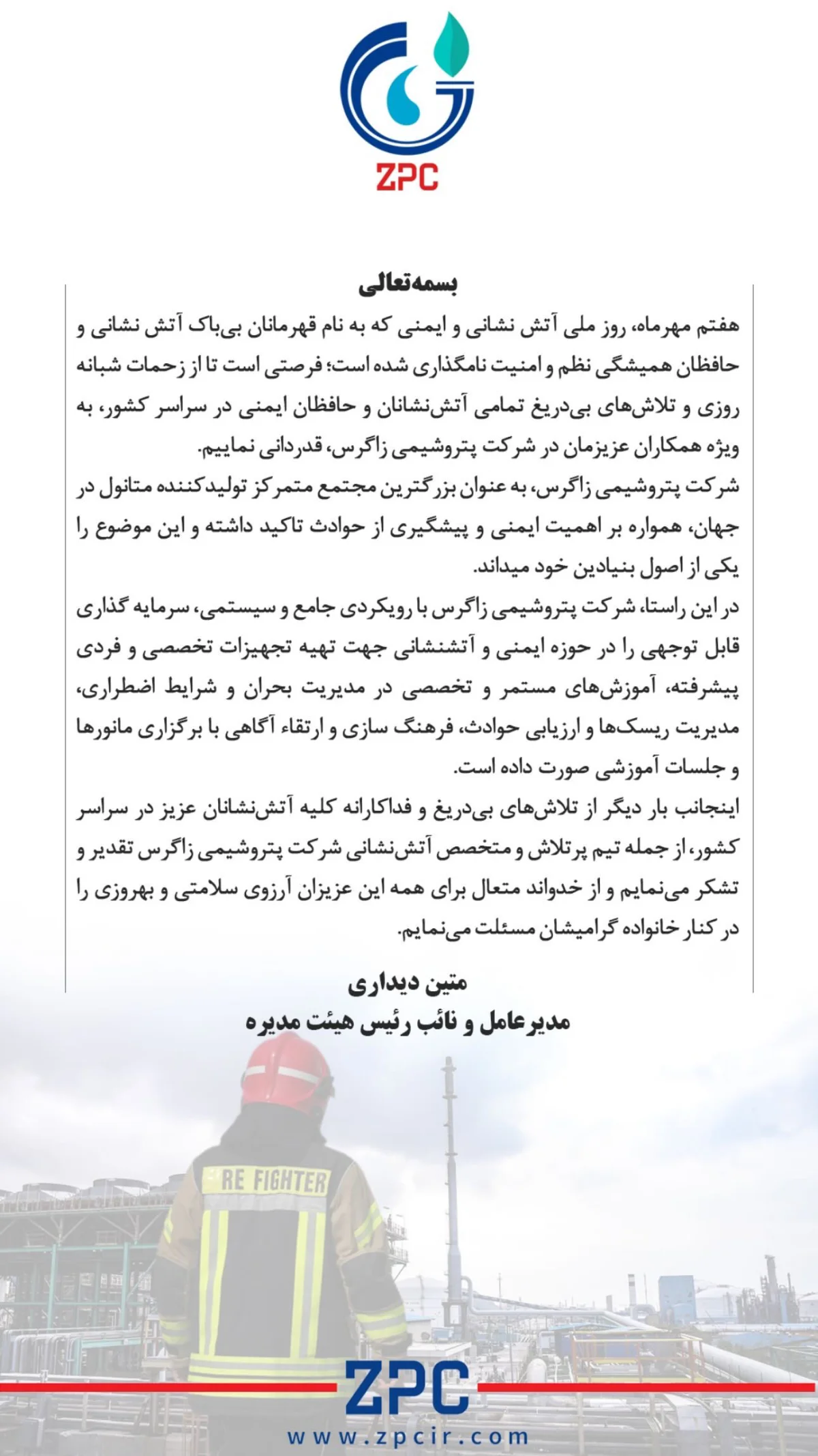 پیام تبریک مدیرعامل شرکت پتروشیمی زاگرس به مناسبت روز آتشنشانی