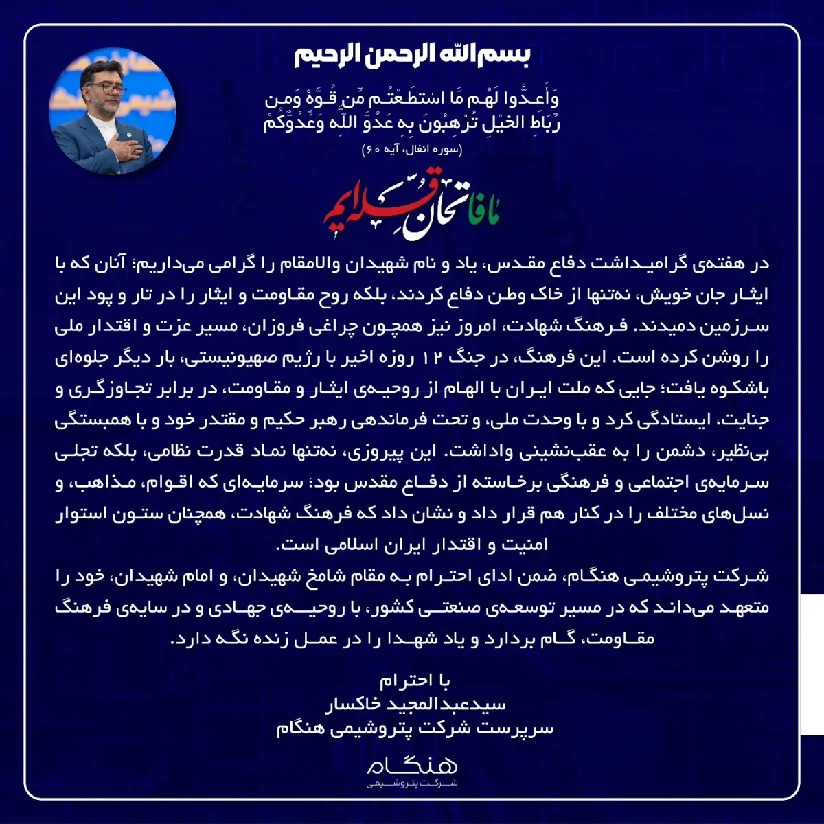 در آستانه هفته گرامیداشت دفاع مقدس، سیدعبدالمجید خاکسار، سرپرست شرکت پتروشیمی هنگام، با صدور پیامی ضمن ادای احترام به مقام شهدا و امام شهیدان، بر تعهد این مجموعه برای پیشبرد توسعه صنعتی کشور با الهام از فرهنگ ایثار و مقاومت تأکید کرد.