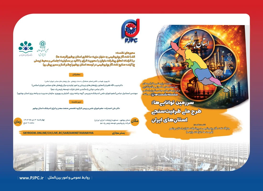 با حضور مدیرعامل شرکت توسعه پلیمر پادجم، معاون پژوهشی مرکز پژوهشهای مجلس شورای اسلامی، سایر اعضای محترم معاونت پژوهشی و کارگروههای اندیشکدههای حکمرانی و قانونگذاری مرکز پژوهشهای مجلس شورای اسلامی؛ نخستین نشست از سلسلهنشستهای طرح ملی «سرزمین تواناییها، ظرفیتسنجی استانهای ایران» با موضوع بررسی جایگاه نفت، گاز و پتروشیمی در پیشرفت متوازن استان بوشهر، به میزبانی شرکت توسعه پلیمر پادجم برگزار گردید.